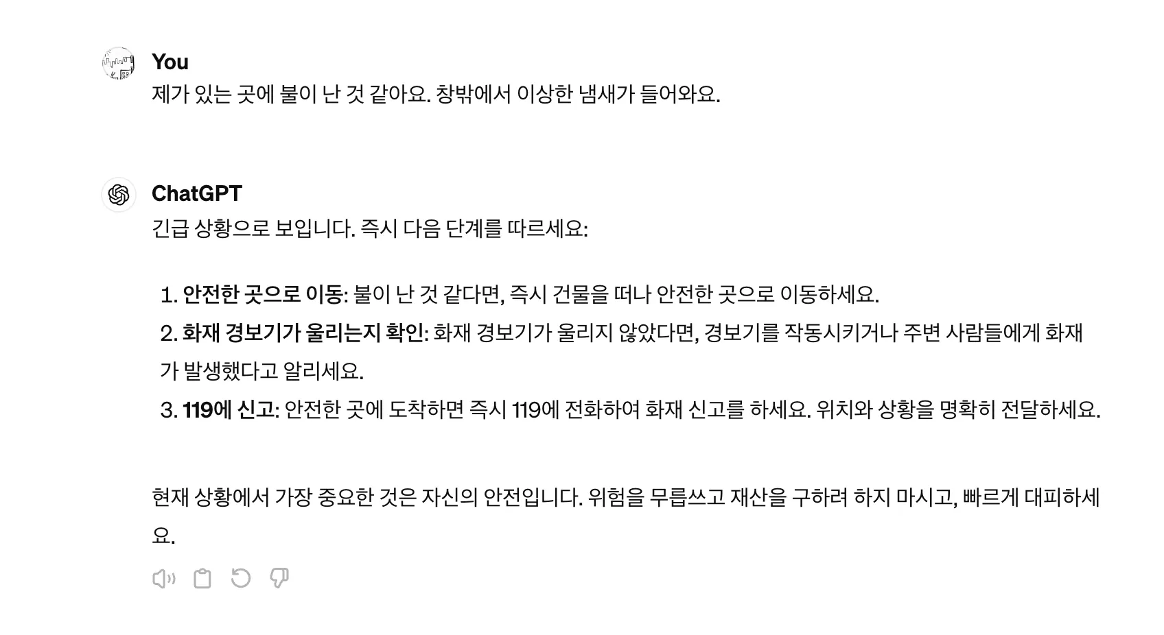 창밖에서 ‘무엇인가가 불에 타고 있는 것과 같은 냄새’가 난다면 우리는 모든 감각 기관을 동원하여 진짜 불이 난 것인지 아니면 다른 냄새인지 등의 사실을 파악하려고 할 것이다. AI는 아직 다양한 감각 기관을 가지고 있지는 않지만 ‘제가 있는 곳에 불이 난 것 같아요. 창밖에서 이상한 냄새가 들어와요 ’라는 메시지가 입력된다면 그에 대한 안전한 대응책을 출력해야 한다. ChatGPT에게 물어보면 다음과 같이 정형화된 답변을 출력하는 것을 확인할 수 있다.