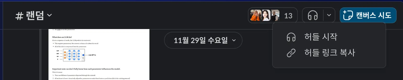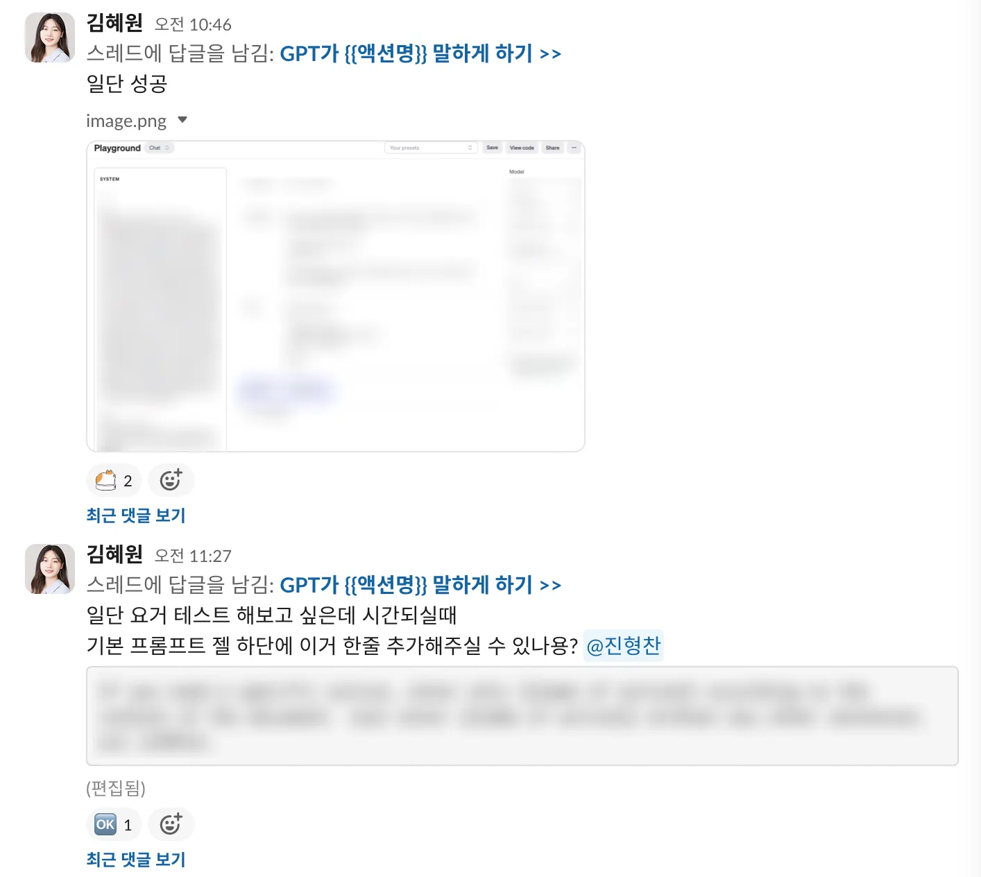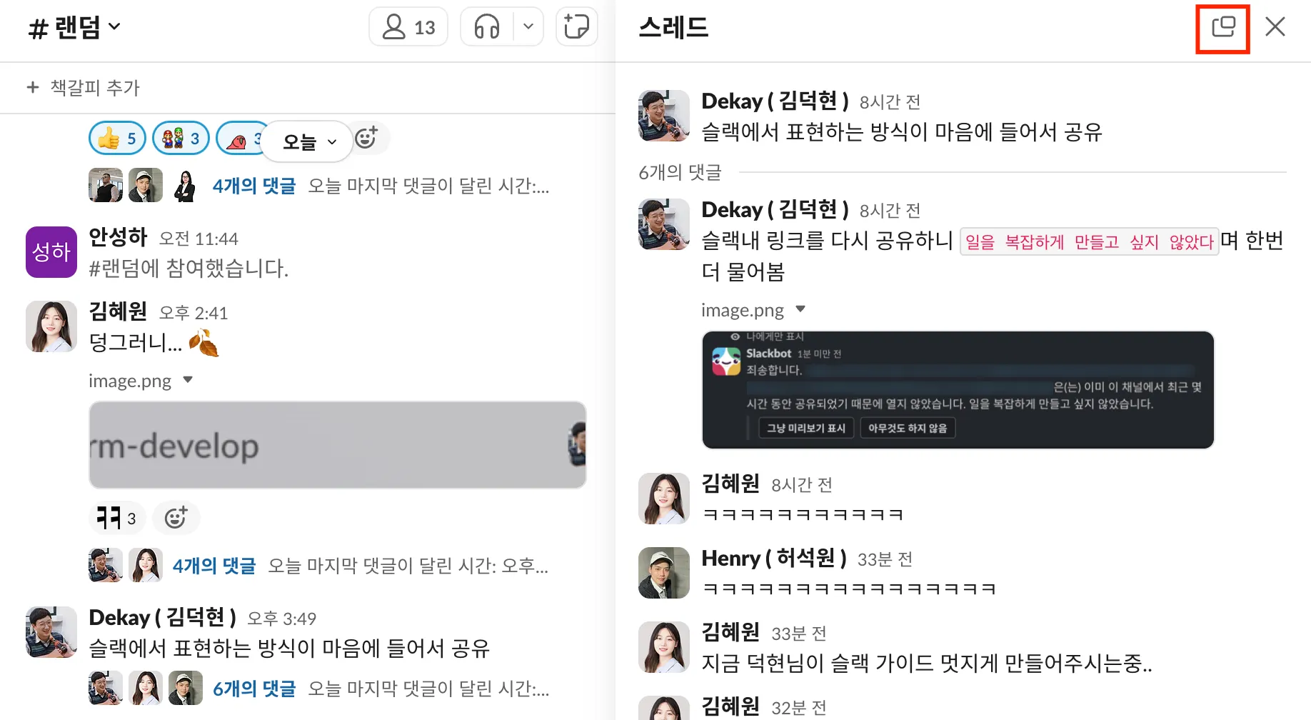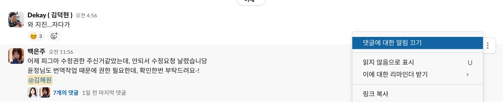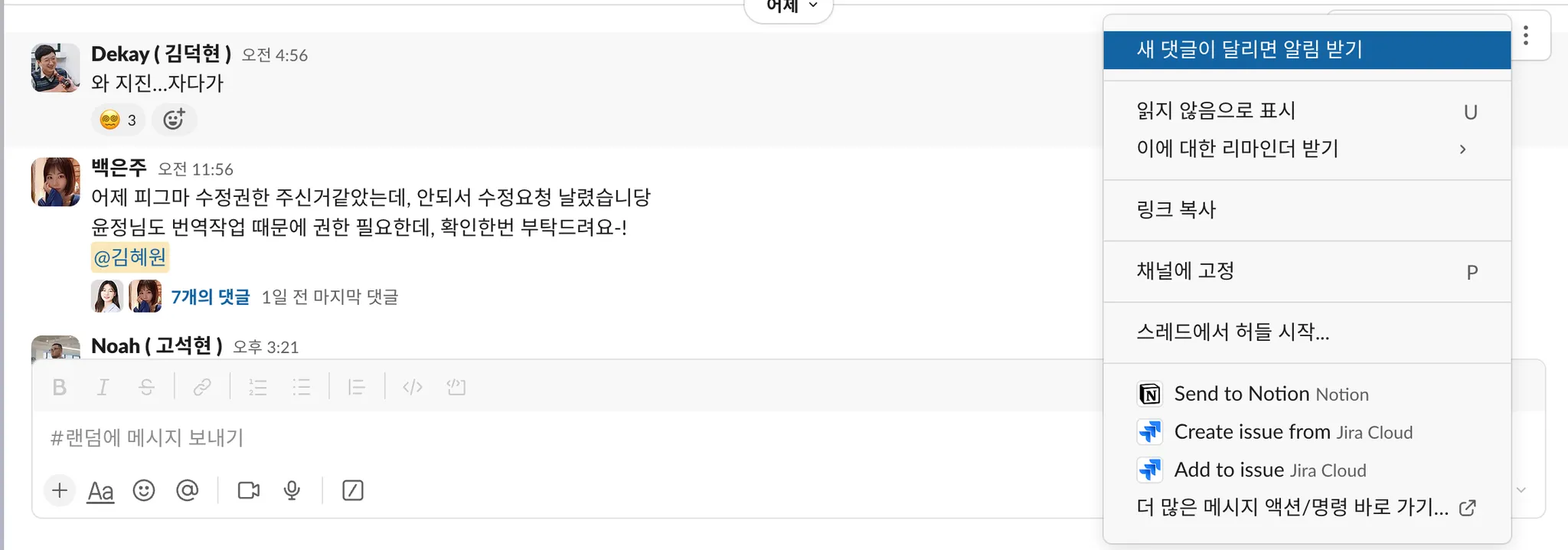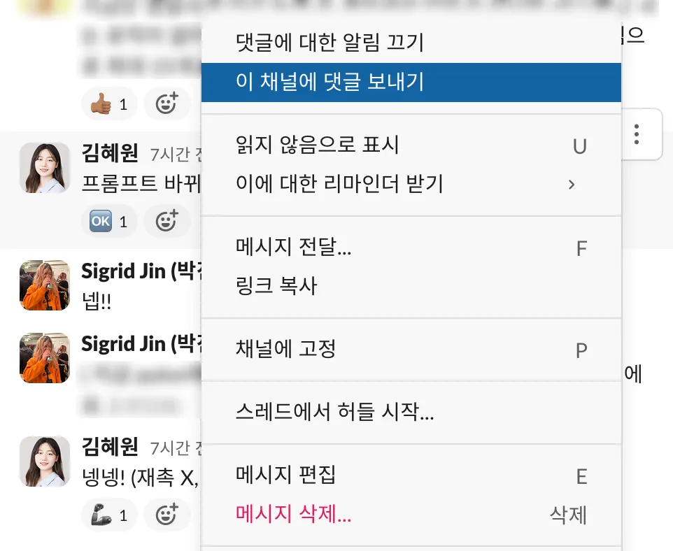스레드 내에서 논의한 내용 중에, 스레드에 참여하지 않은 사람들에게도 공유되어야하는 내용이라면 이 채널에 댓글 보내기 기능을 활용해보세요