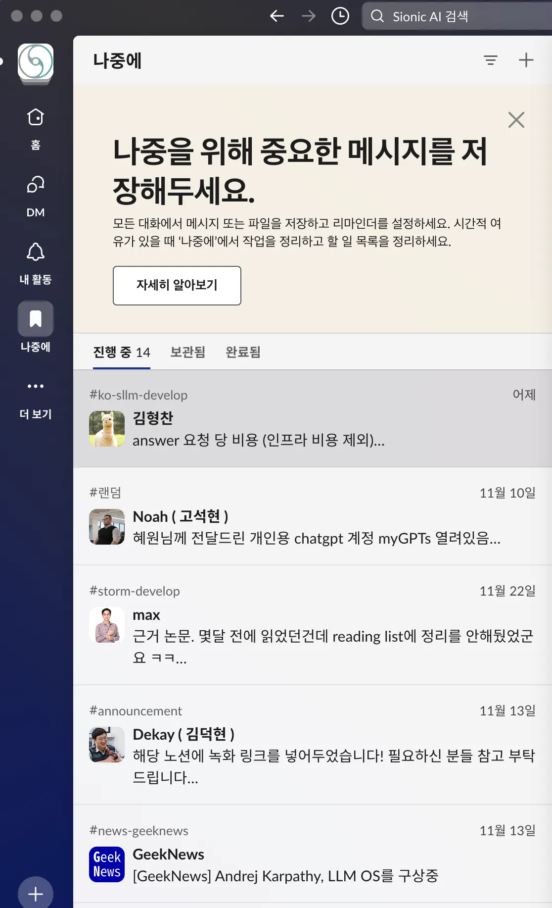 쏟아지는 슬랙 메시지에 계속해서 메시지를 놓치는 경험을 하셨다면, 나중에 기능을 활용해서 태스크 관리를 하세요.