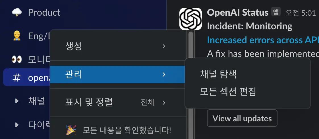 채널 → 관리모든 섹션 편집 메뉴에서 좌측 채널들을 섹션별로 관리할 수 있어요.