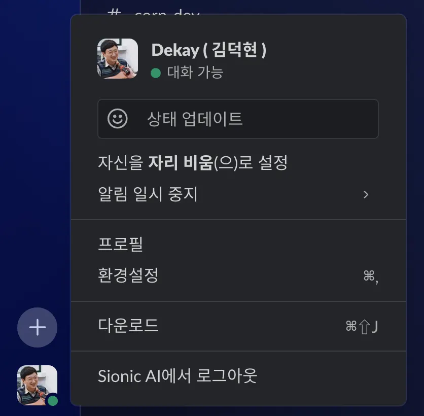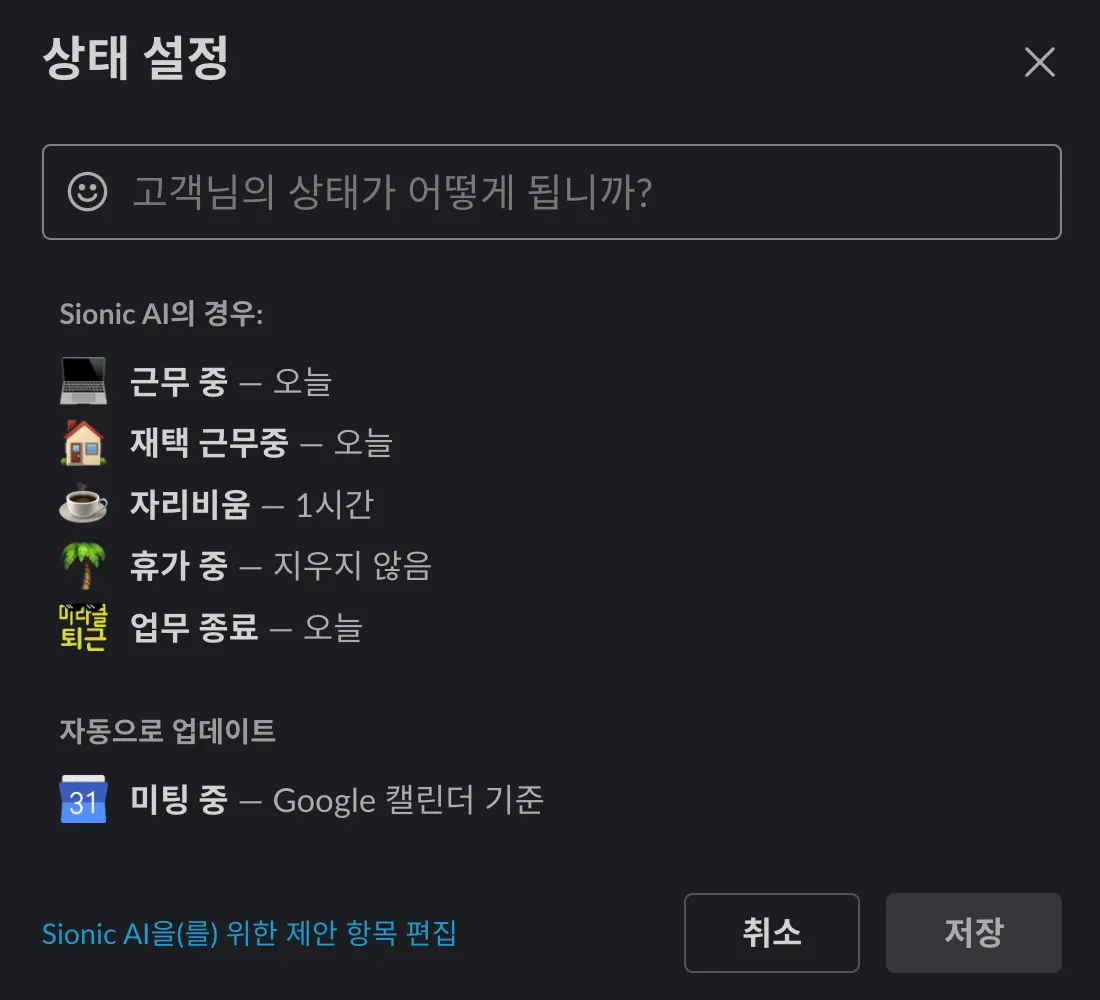 예시2) 근무중인데 재택중, 근무중인데 집중중(개발 중이니 건들지마세요 모드), 휴가중, 오늘 업무 종료!
