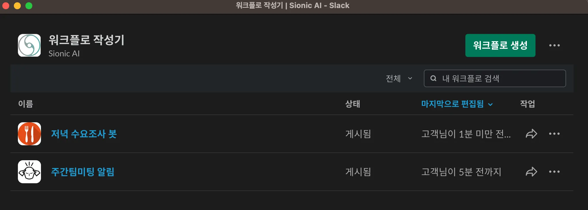 워크스페이스 설정 → 도구 및 설정 → 워크플로 빌더 메뉴에서 편집할 수 있어요.