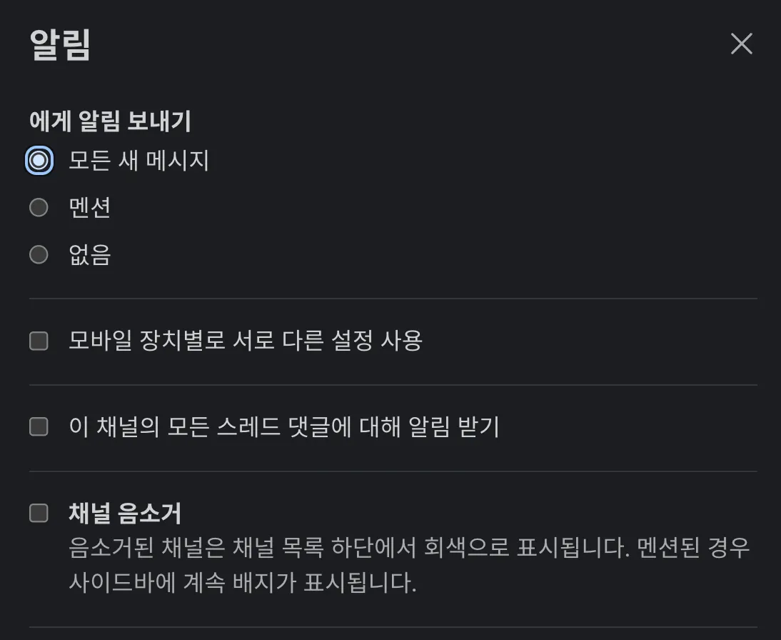 자주 방문하는 채널이 아니라면 모든 새 메시지에 알림 받기보다 멘션만 알림받기 옵션을 추천해요.