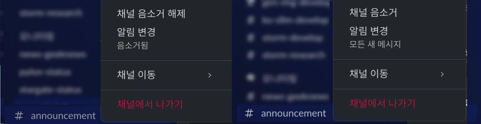 채널 음소거: 알림이 울리지 않습니다. 멘션은 뱃지가 흰색으로만 표시됨