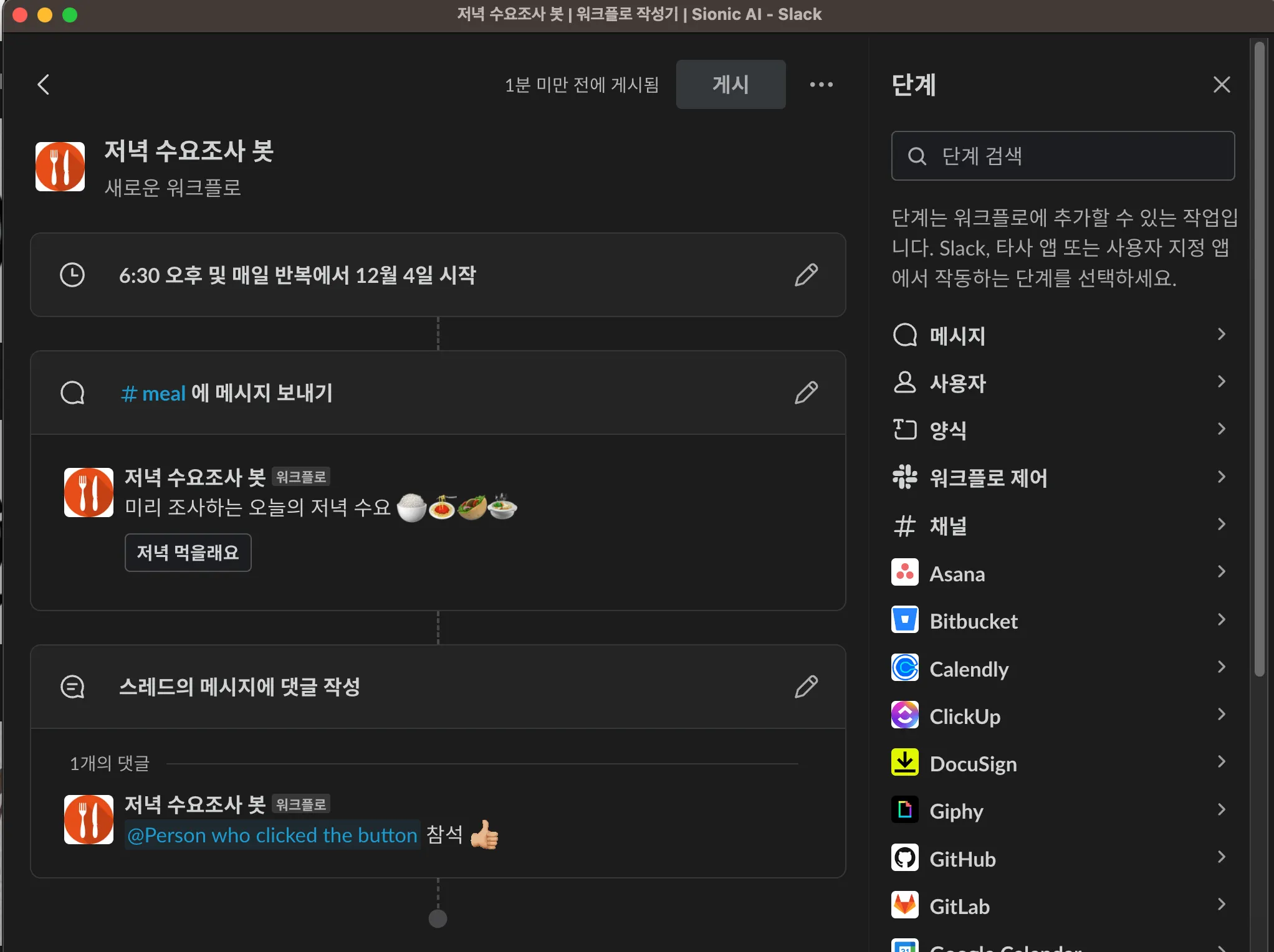 예시) 오후 6:30 메시지 전송 → 저녁 먹을래요 버튼 클릭 시 → 버튼 누른 사람 이름을 스레드로 기록