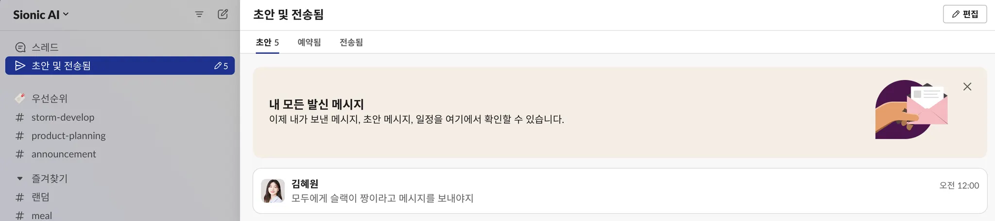급한 업무를 마무리하고 다시 초안에 작성중이던 메시지를 찾아서 이어 작성하면 됩니다.