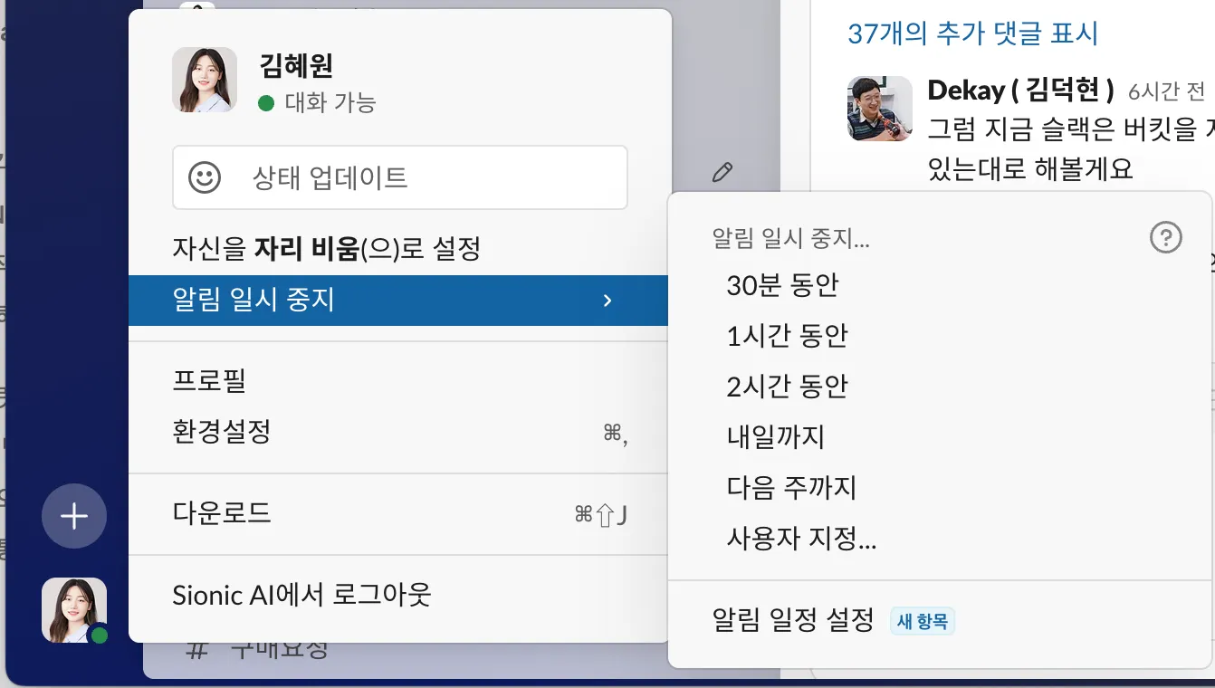 잠시 회의에 집중해야하거나 집중모드로 업무 효율성을 높이고 싶다면 알림 일시 중지 기능을 이용해보세요