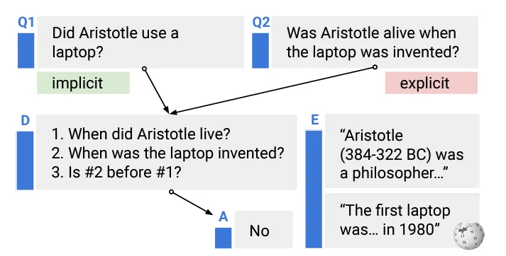 암시적인 질문인 ‘아리스토텔레스는 노트북을 사용했는가’에 답하기 위하여 명시적인 질문인 ‘노트북이 발명되었을 때 아리스토텔레스는 살아있었는가’ 로 변형하는 작업. 이를 위해 정답을 도출하는 프로세스를 설명하는 데이터의 특성을 지님
