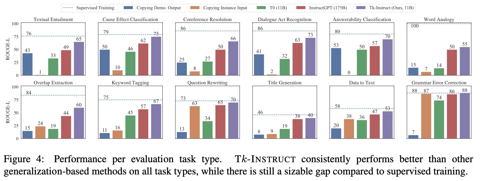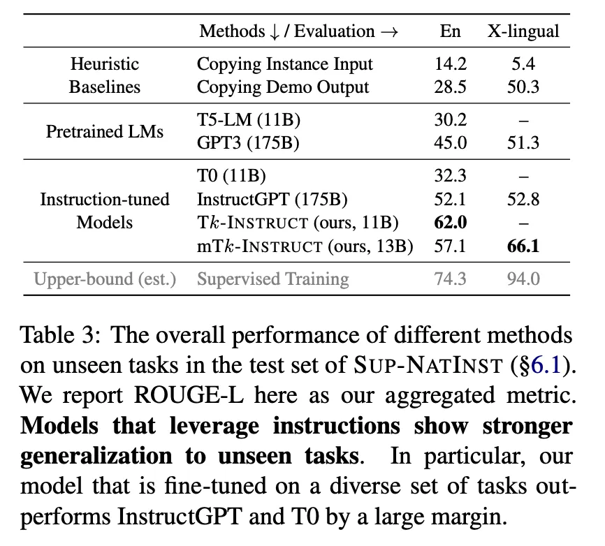 다국어 : 발표 당시 기준 InstructGPT 대비 ROUGE-L 점수 기준 13.3점 높음 (52.8 vs 66.1)