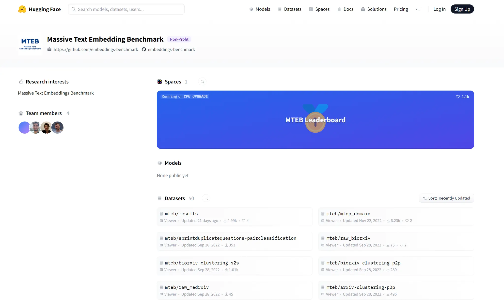 다양한 임베딩 작업에서 텍스트 임베딩 모델의 성능을 측정하기 위한 만든 대규모 벤치마크