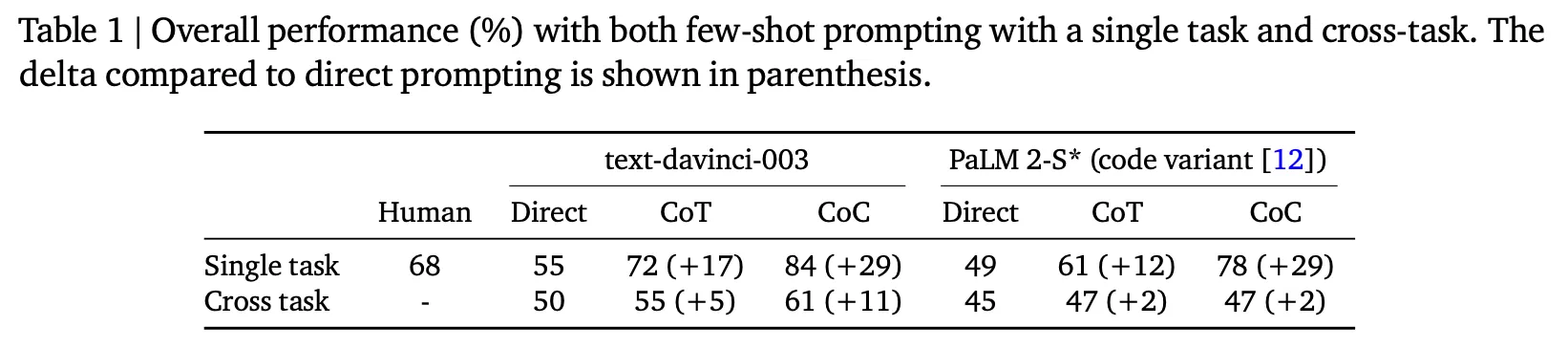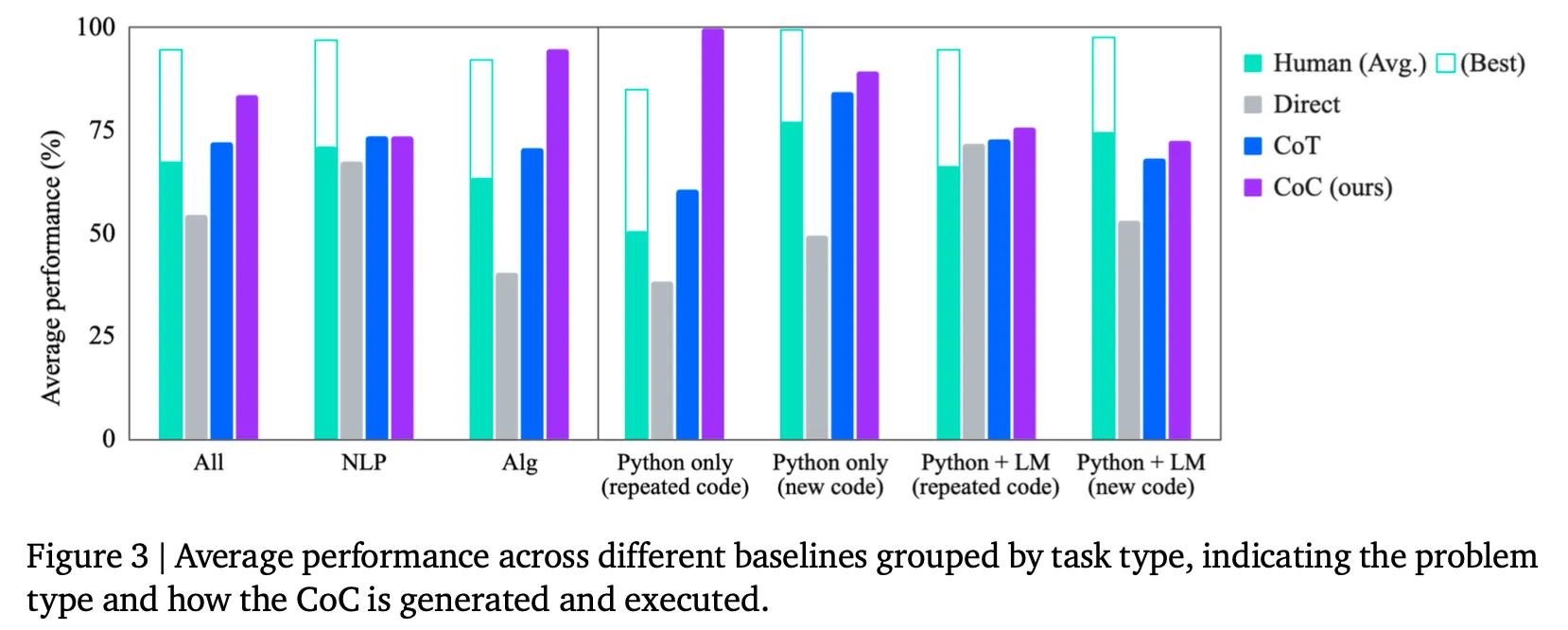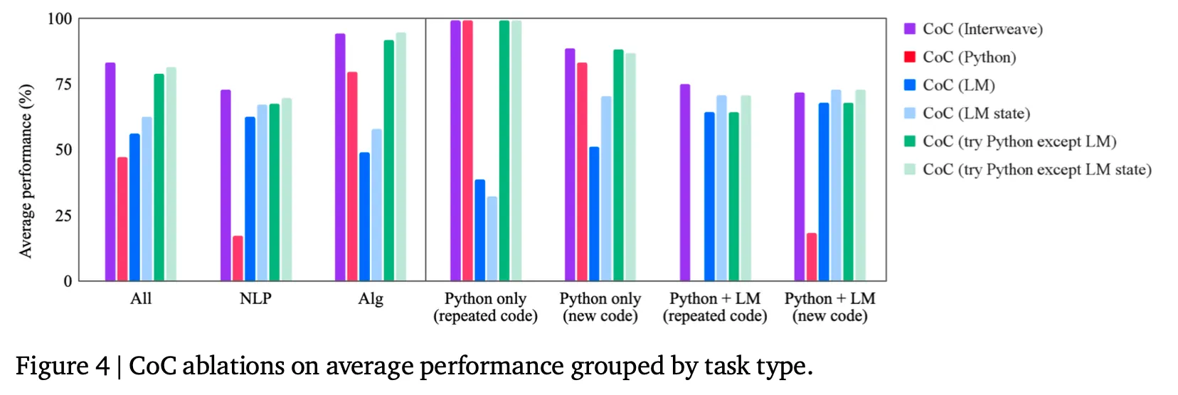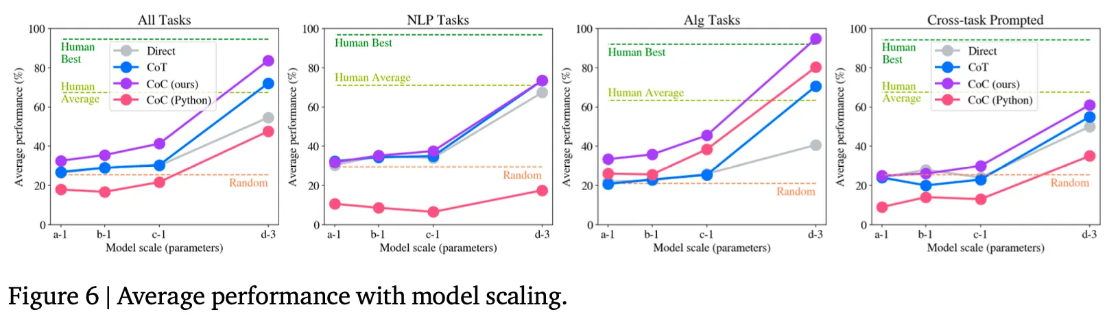 특히 CoT는 일정 크기 이상의 LM에서만 효과가 있었던 것과 달리 CoC는 작은 LM에서도 효과가 있었음