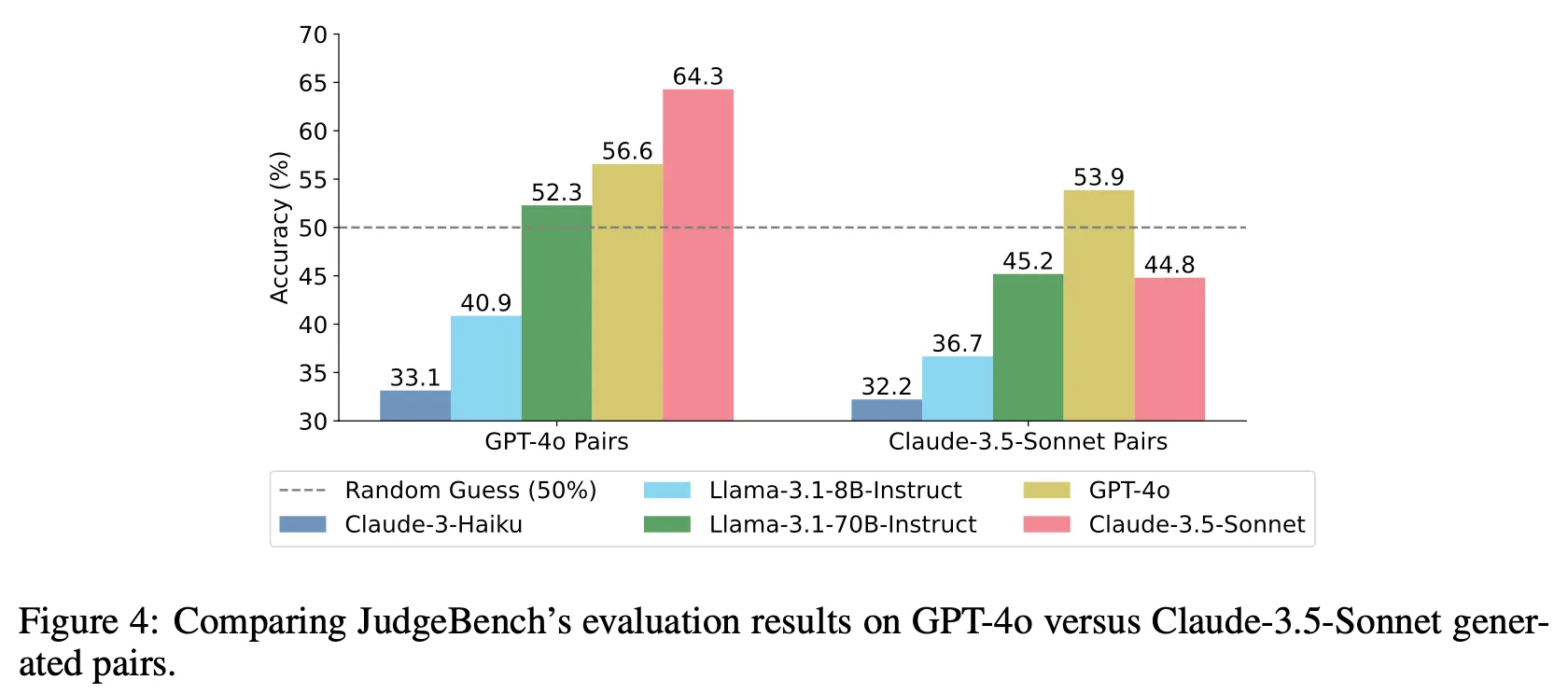 추가로 전체적으로 Sonnet이 생성한 데이터에서 더 낮은 성능을 보임. 이는 JudgeBench용 데이터 생성에 있어서 Sonnet 모델이 더 어려운 문제를 만들 수 있다는 것을 의미