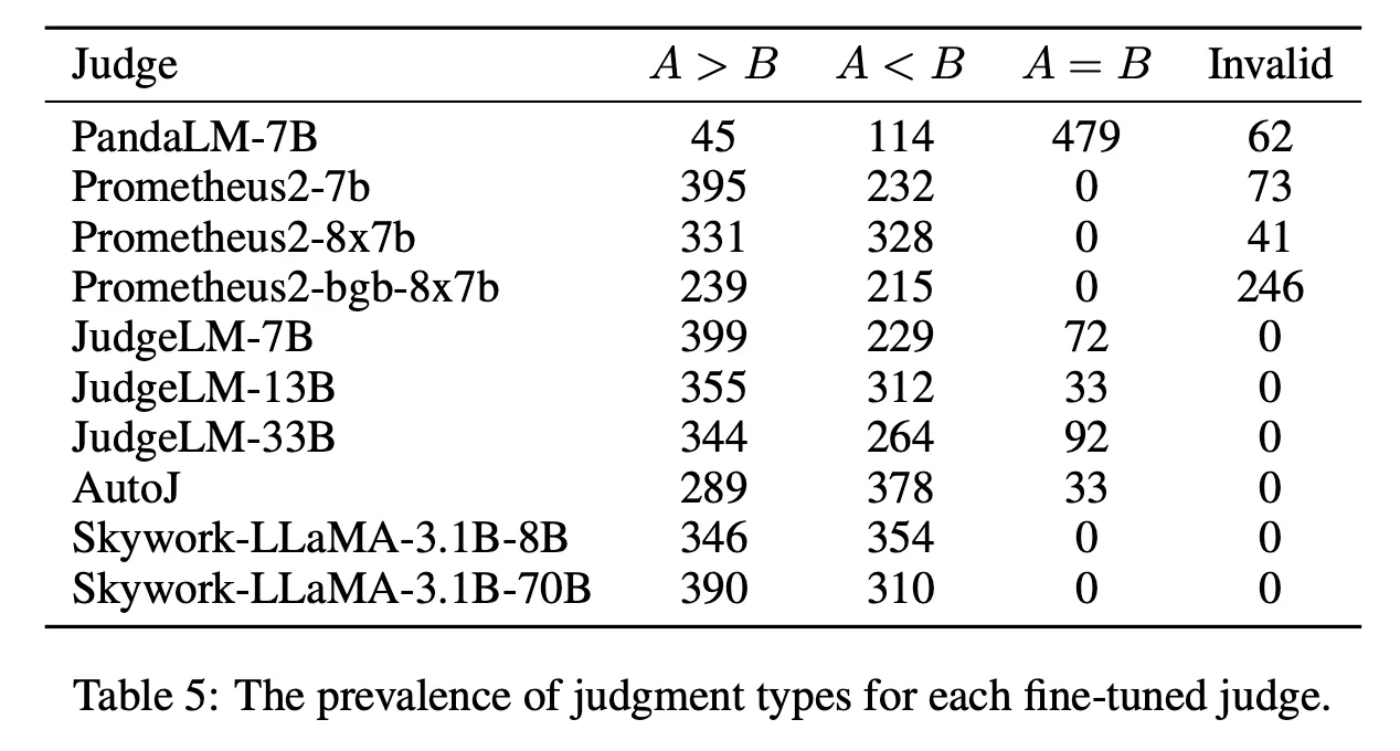 2) Tie 혹은 Invalid한 평가 결과를 출력하는 경우가 꽤 많음 (PandaLM, Prometheus2-bgb 등)