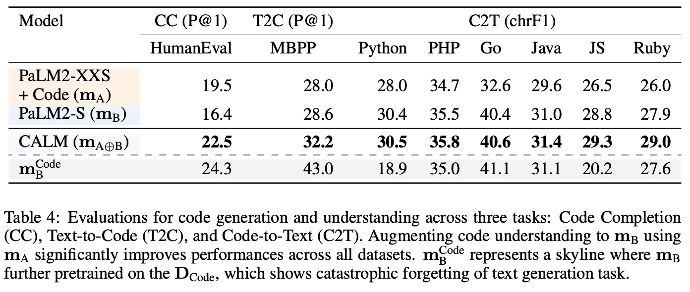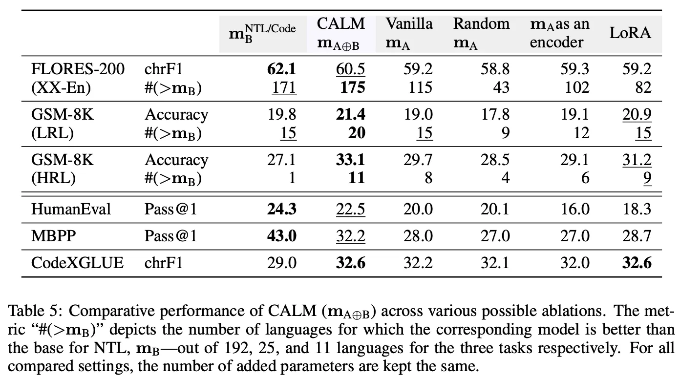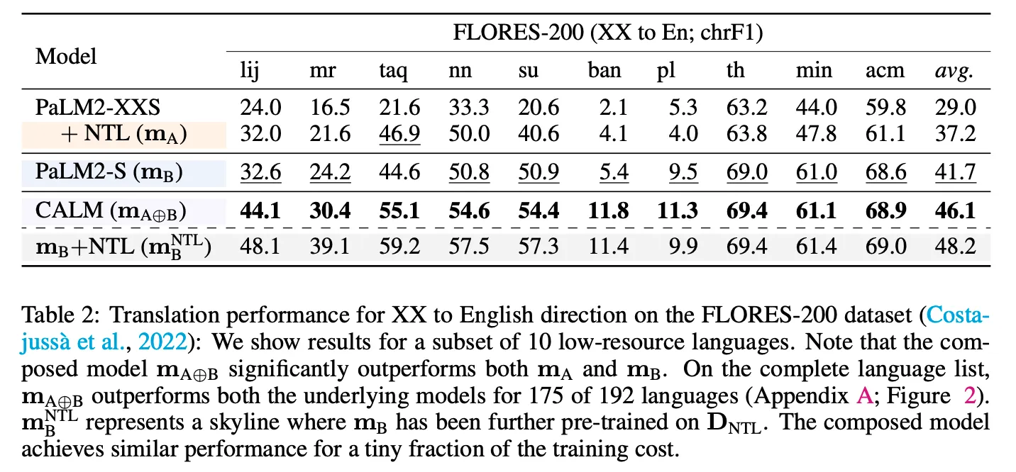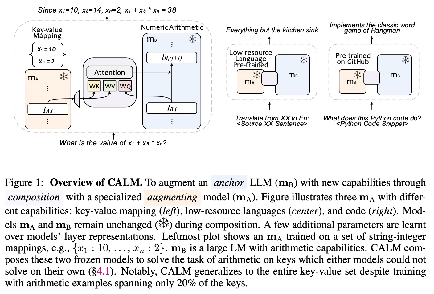 CALM : 서로 다른 두 개 이상의 pretrained LM을 사용. 모델의 대부분 구성 요소가 독립적이며 중간에 간단한 composition layer로 연결하는 방식으로 각각의 능력도 살리면서 조합 능력을 발현시킴. MoE 구조와 여러 모델을 ensemble 하는 방법의 중간 형태의 느낌