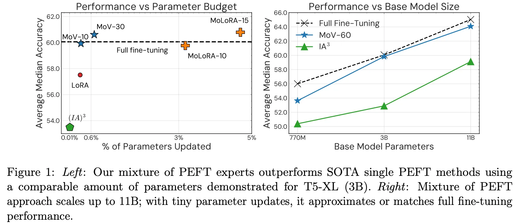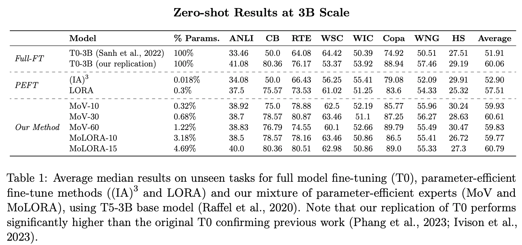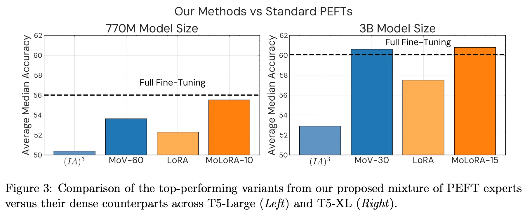 3B 모델 기준으로 0.68%(MoV-30)~4.69%(MoLORA-15) 정도의 파라미터 학습만으로 fine-tuning 경우와 비슷한 성능을 달성