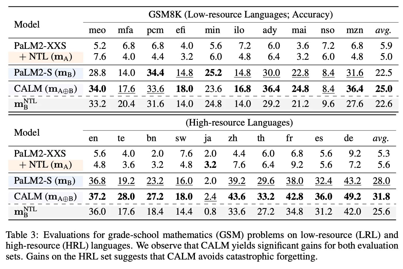 CALM을 통하여 번역 task에서 reference 대비 훨씬 좋은 성능을 보여주며 GSM8K의 경우 low-resource 및 high-resource 언어 모두에서 가장 좋은 성능을 보임