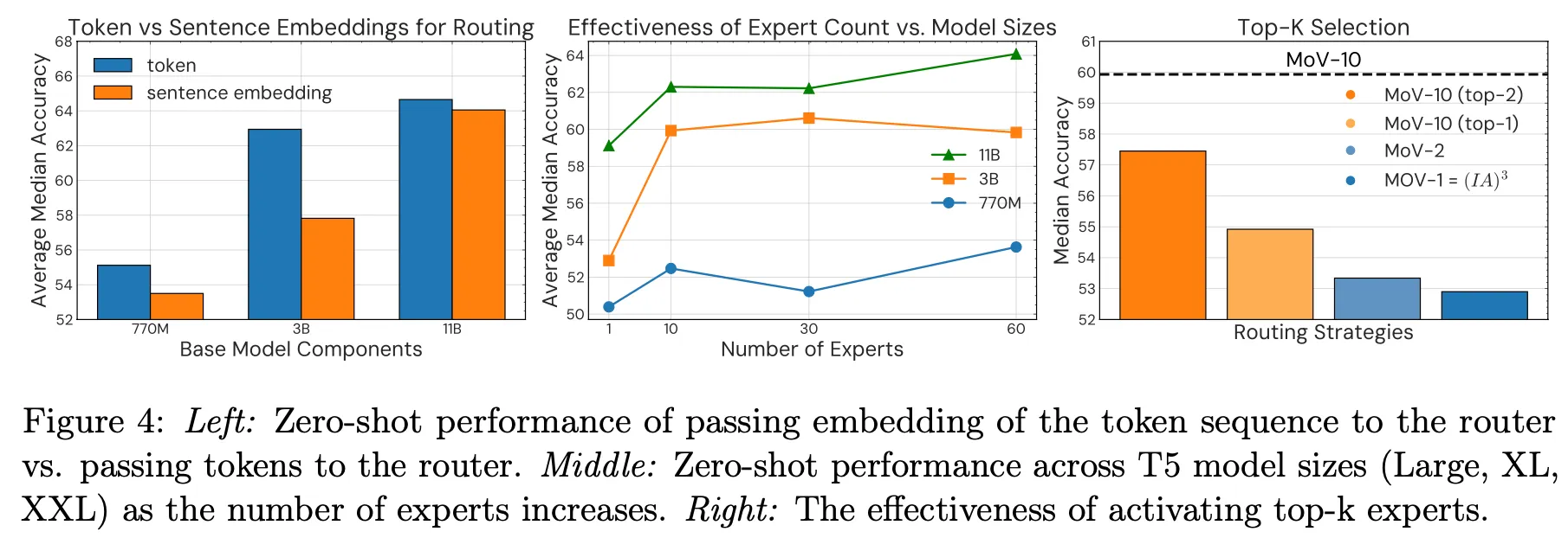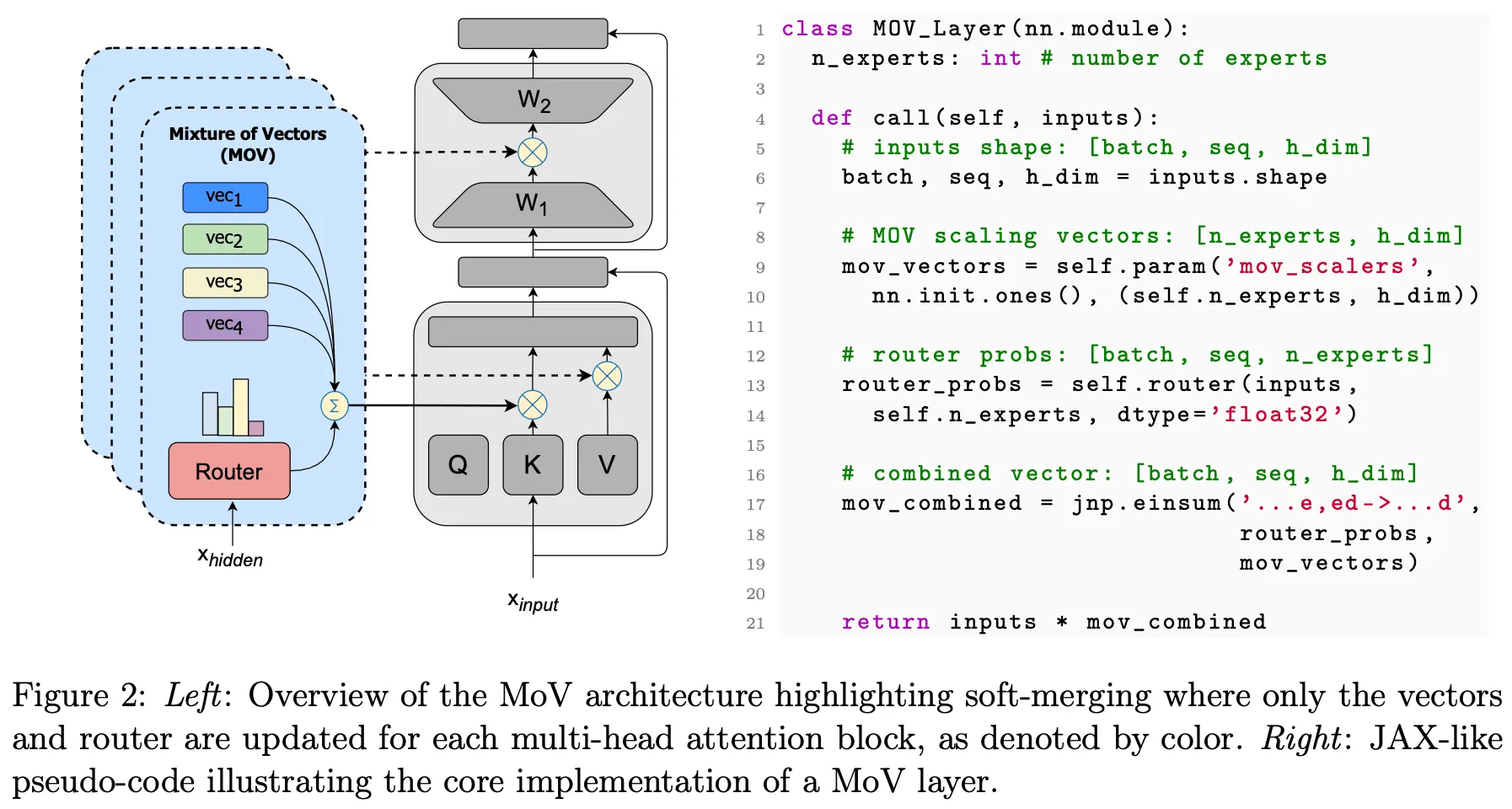 MoV(Mixture of Vectors) 및 MoLORA(Mixture of LoRAs)의 경우 기존의 expert network 대신 PEFT adapter를 사용하는 방식. fine-tuning할 때 기존 pretrained model의 파라미터를 모두 사용하며, expert와 router layer만 from scratch로 학습을 수행함.