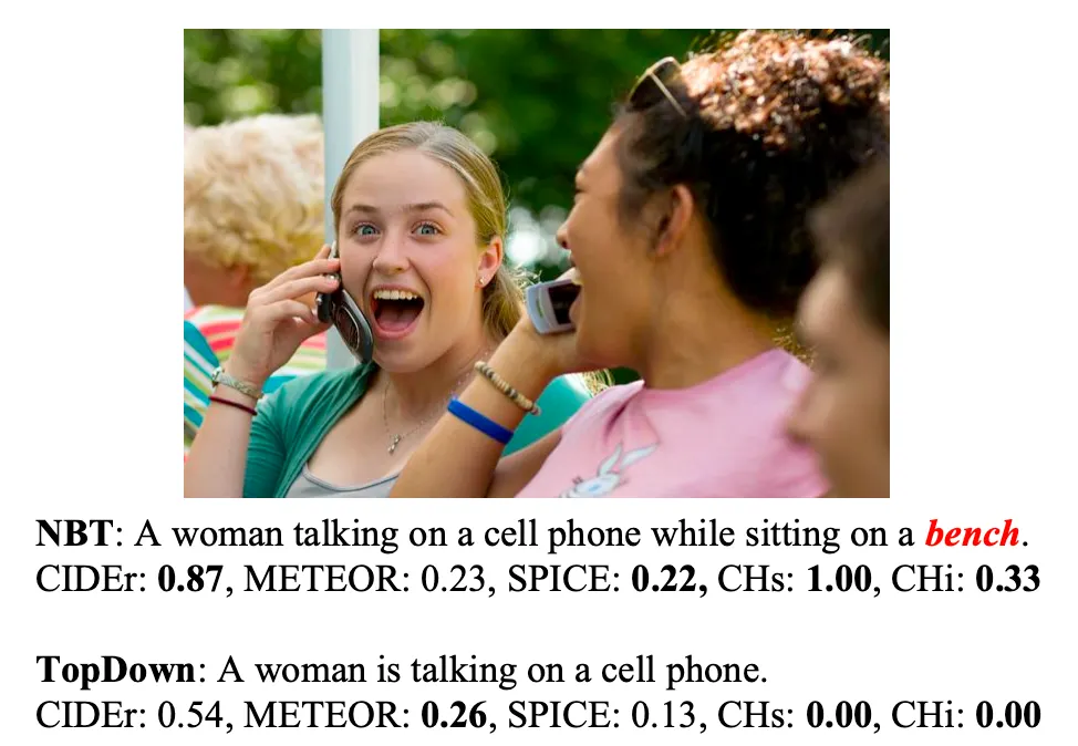 Image Captioning에서 사용하는 기존 metric들의 경우 이미지에 없는 사물을 기술하는 hallucination 현상을 제대로 측정하지 못하는 경우가 존재함