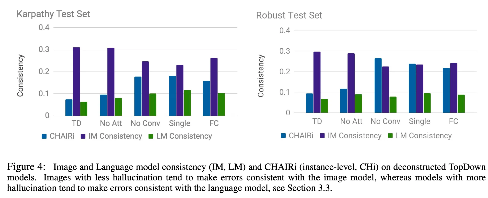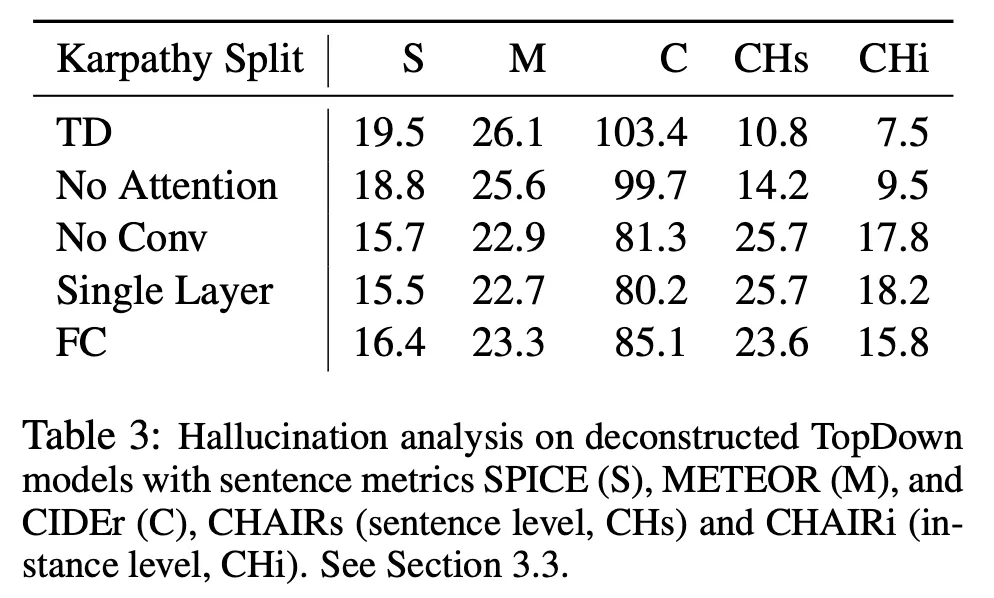 Convolutional Layer가 hallucination 성능에 가장 큰 영향을 미치며 attention은 비교적 minor한 영향을 미침. 이것으로 볼 때 실제 attention mechanism 보다는 입력 이미지의 spatial feature를 활용하는 것이 더 중요하다는 것을 알 수 있음