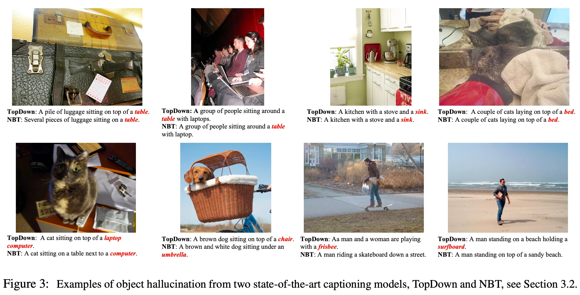 captioning text에 특정 단어가 출현하면 이미지에 없더라도 잘못된 object를 생성하는 경향이 존재