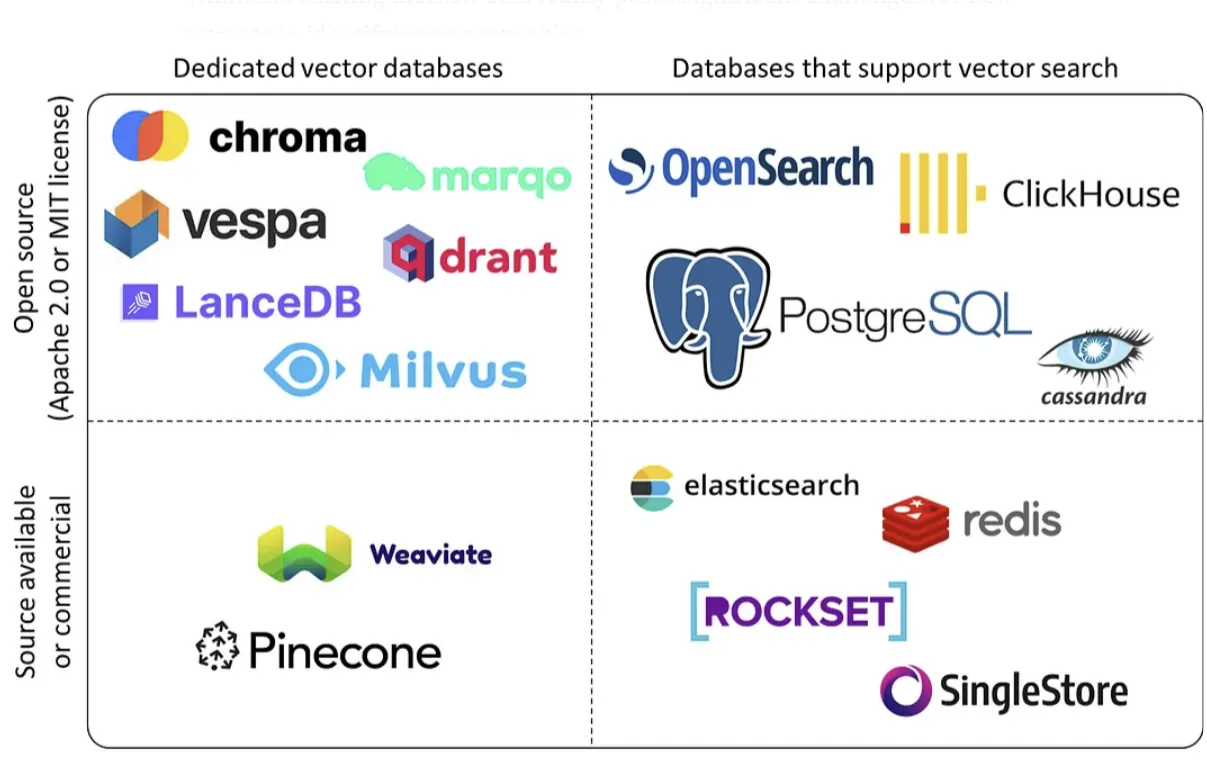 위에서 나열된 벡터 DB의 선택지를 벡터 전용 데이터 베이스(좌상)인가 아니면 벡터 검색 지원 데이터 베이스(우상)인가에 따라 나누고 이를 오픈소스로 쓸 수 있는가(좌하), 상업적 사용이 가능한가(우하)로 나누면 다음 이미지와 같습니다.
