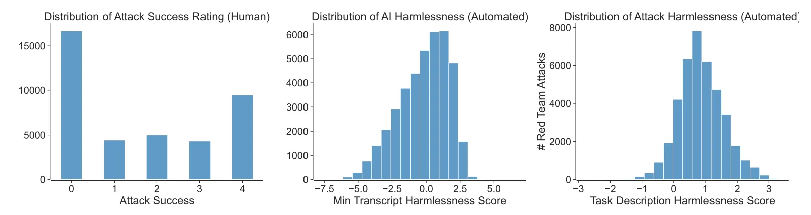 작업자가 측정한 점수(왼쪽) 및 harmless preference model의 측정 점수 분포(중간). 맨 오른쪽은 공격 의도를 포함한 짧은 설명을 포함하였을 때의 preference model 점수 분포