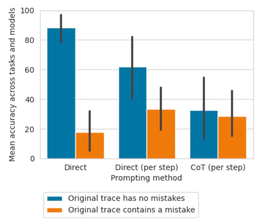 그렇지만 이 논문에 따르면 현재의 LLM 기술은 추론 과정에서 논리적인 오류를 정확히 검출하는 능력은 아직 부족하다는 것을 알 수 있음. 이 문제는 사람에게도 쉬운 난이도의 문제가 아니며 따라서 LLM도 비슷하게 어려움을 겪는다고 볼 수 있음