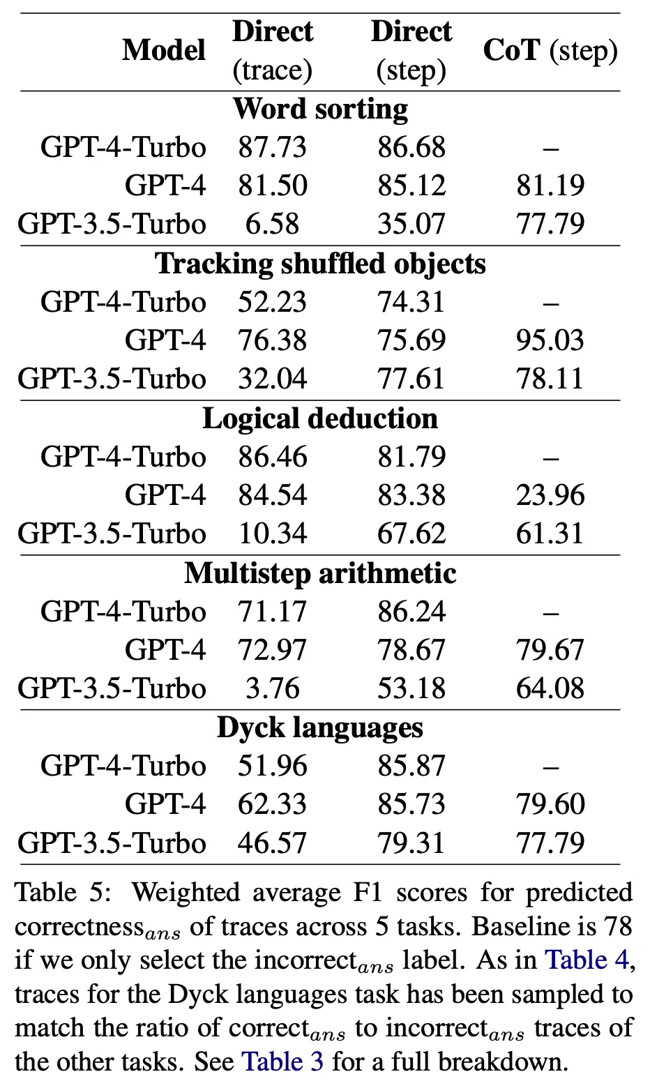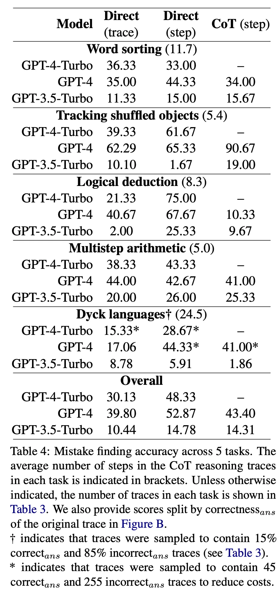 Dyck languages를 제외한 4가지 task는 답변이 틀린 것 85%(255개)과 맞은 것 15%(45개)를 샘플링한 후 사람이 일일히 검수하여 어떤 step에서 오류가 발생하였는지 annotation을 수행