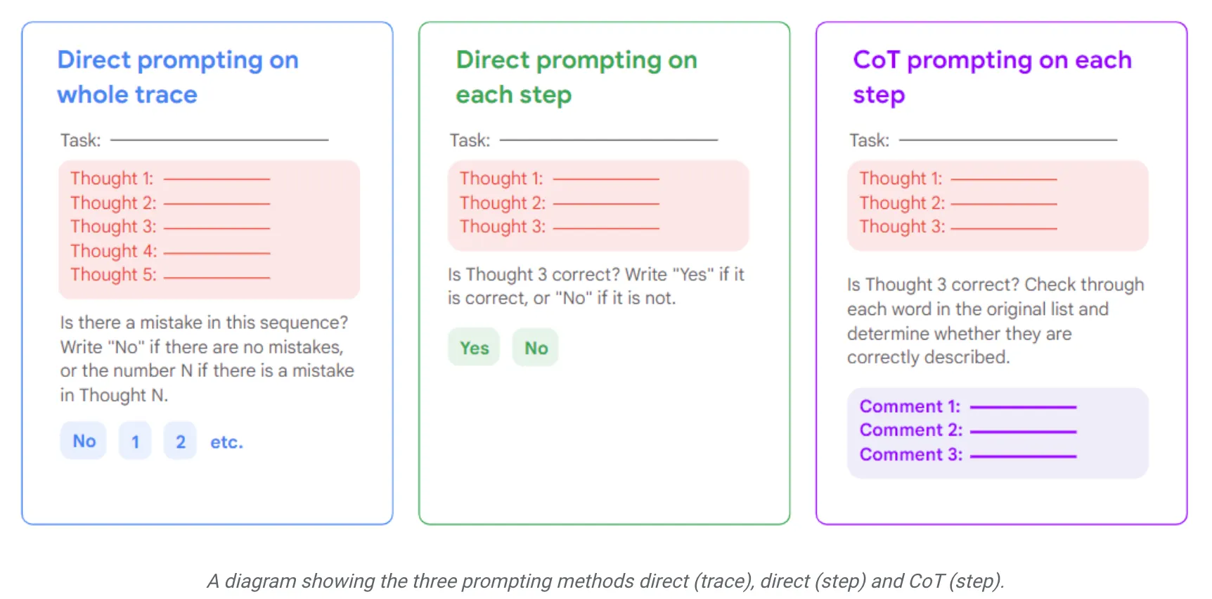 3가지 종류의 prompt를 사용 : direct trace-level, direct step-level, CoT step-level