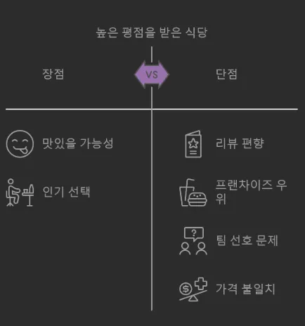 위의 방법으로 가장 리뷰 수가 많은 식당 뿐만 아니라, 미리 분류해 놓았다면 가장 가성비가 있다는 평이 많은(비율이 높은) 식당 등을 찾을 수 있습니다. 하지만 여전히 다른 팀원의 선호를 반영해 메뉴를 추천하기는 어렵습니다.