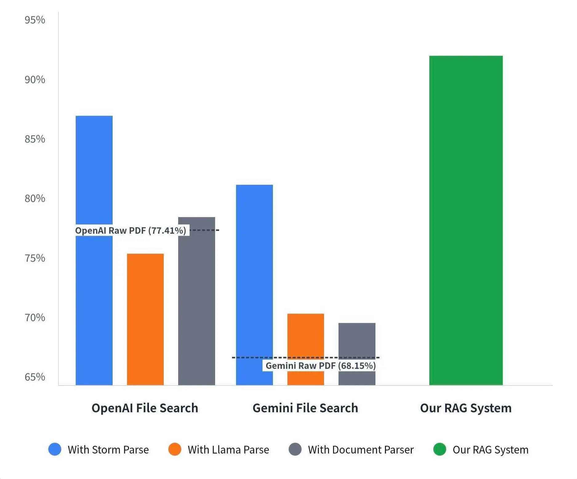 통합 솔루션의 최고 성능: STORM Parse를 자체 RAG 파이프라인과 함께 사용했을 때 91.85%로 최고 성능을 기록했습니다. 이는 파싱뿐 아니라 청킹, 검색, 프롬프팅까지 전체가 최적화되었을 때의 결과입니다.