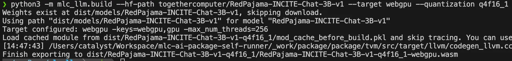 python3 -m mlc_llm.build --hf-path togethercomputer/RedPajama-INCITE-Chat-3B-v1 --target webgpu --quantization q4f16_1