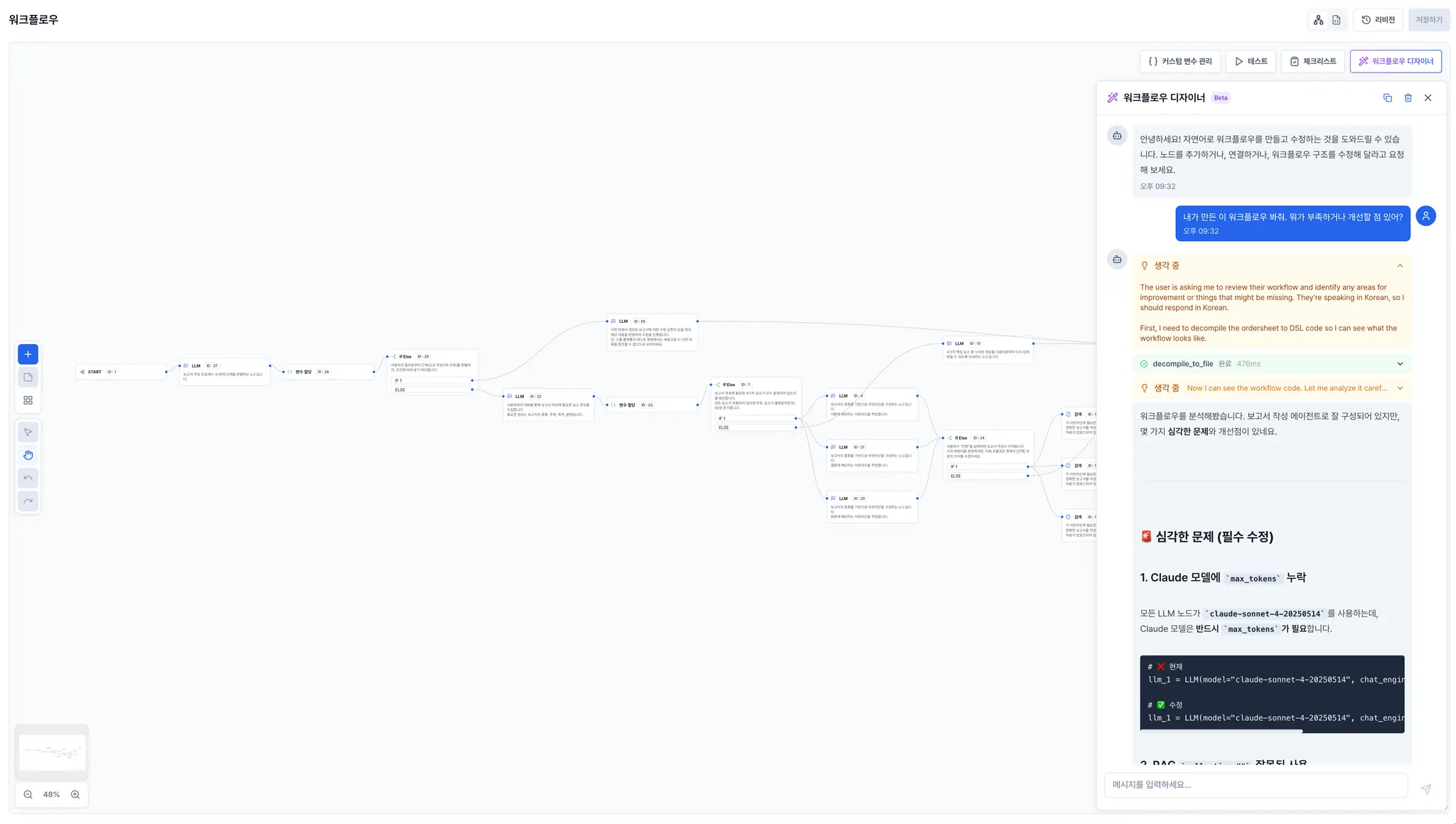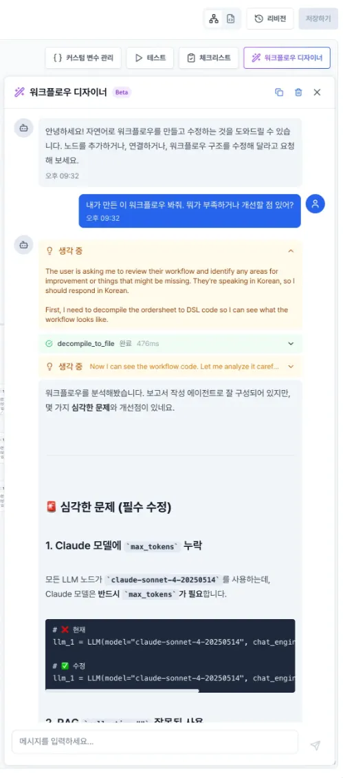 "내가 만든 이 워크플로우 봐줘. 뭐가 부족하거나 개선할 점 있어?"