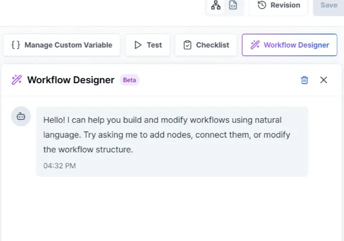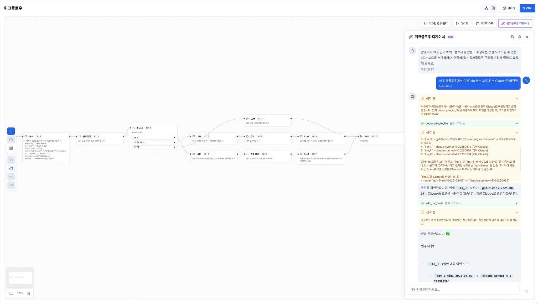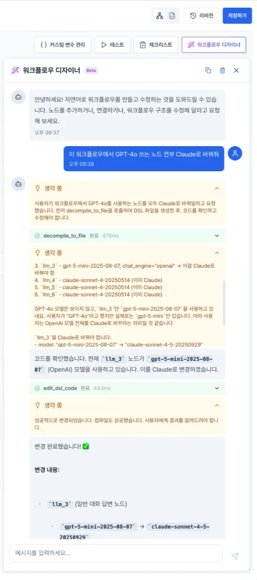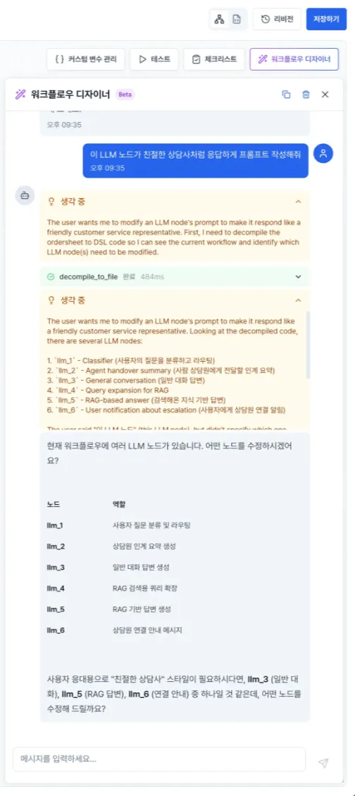 워크플로우 디자이너: "반영했습니다. 이모티콘 없이 친절한 톤을 유지하도록 수정했습니다. 완성된 워크플로우를 확인해보시겠어요?"